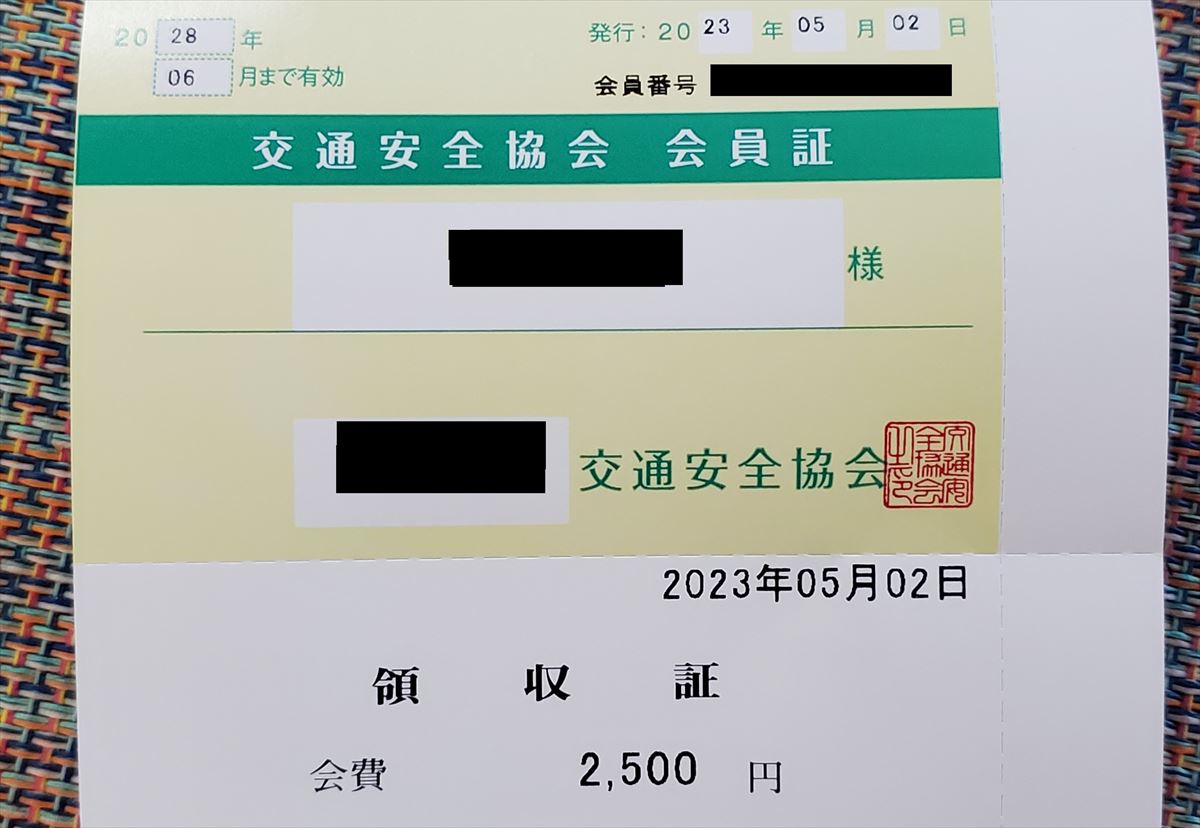 任意ですが、交通安全協会への案内があります。年会費500円、5年で2,500円、私はハンカチをいただきました。