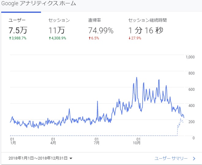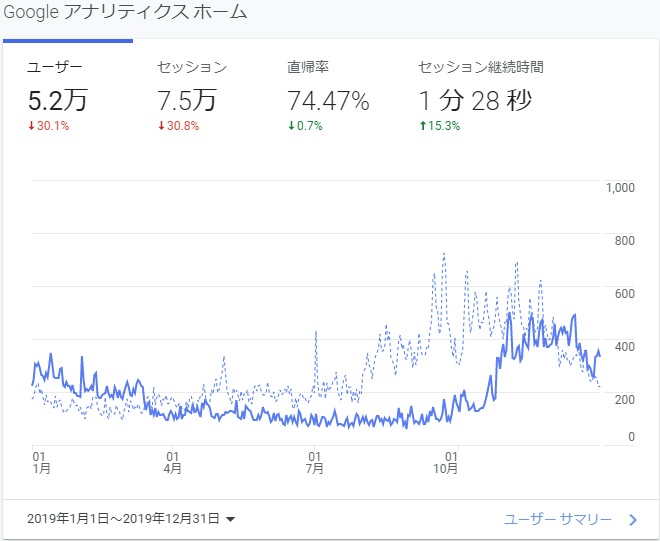 あれこれ対策を行いようやく11月頃に回復し始めましたが、年間を通すと2018年の総ユーザー数7.5万に対し2.3万減の5.2万、年間収益も諭吉2枚ほど下がり4枚ほどです。収益はもともと大したことがないですからね。